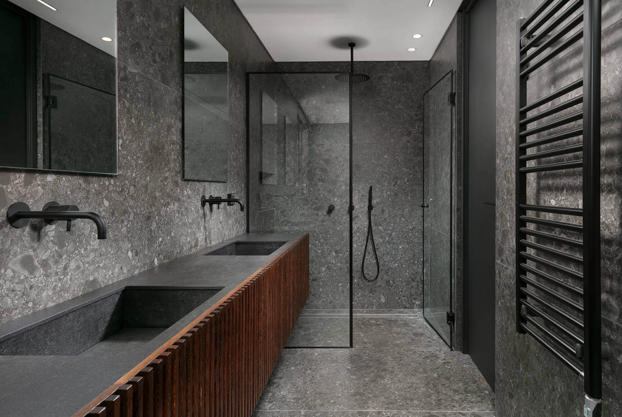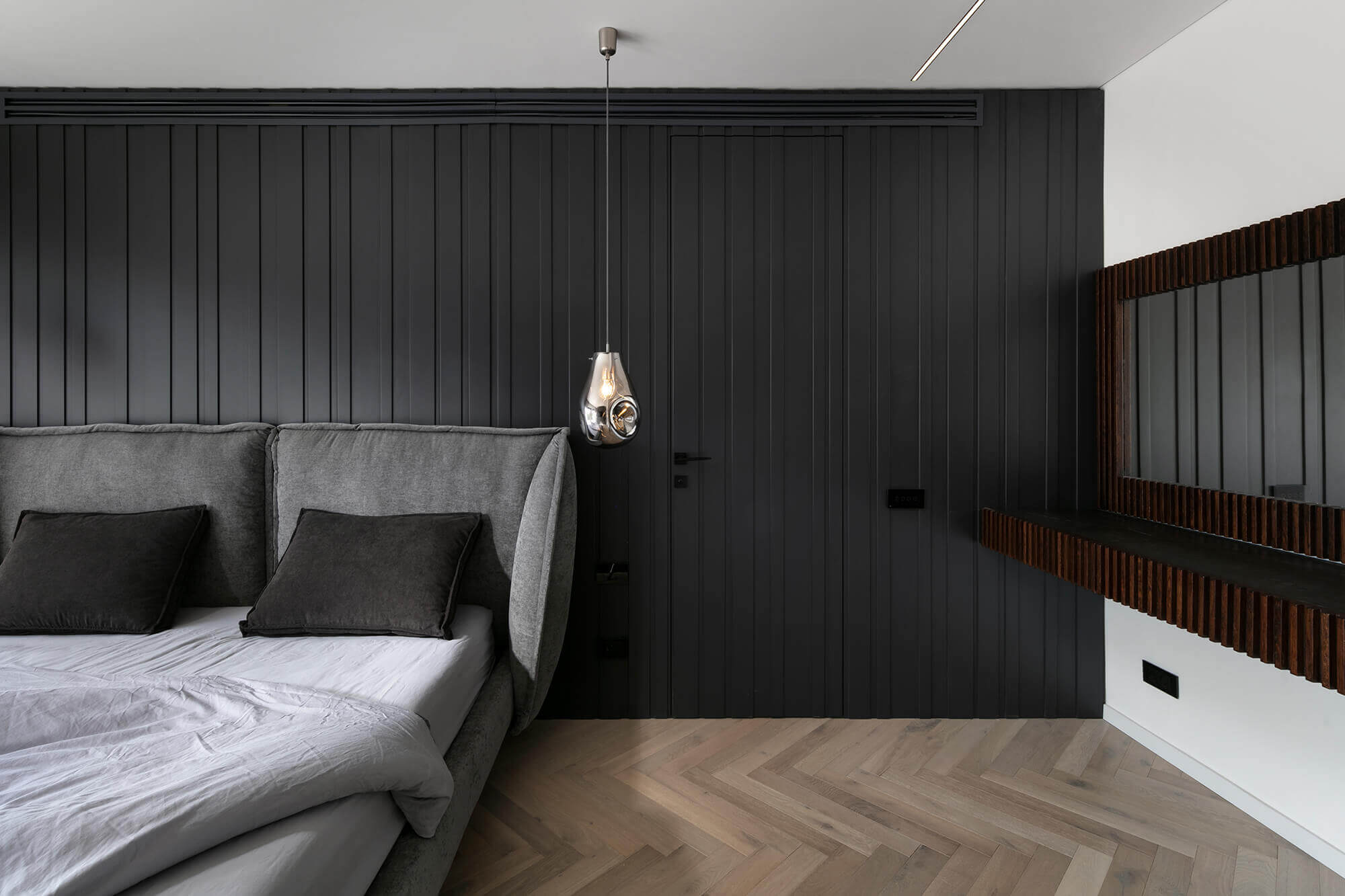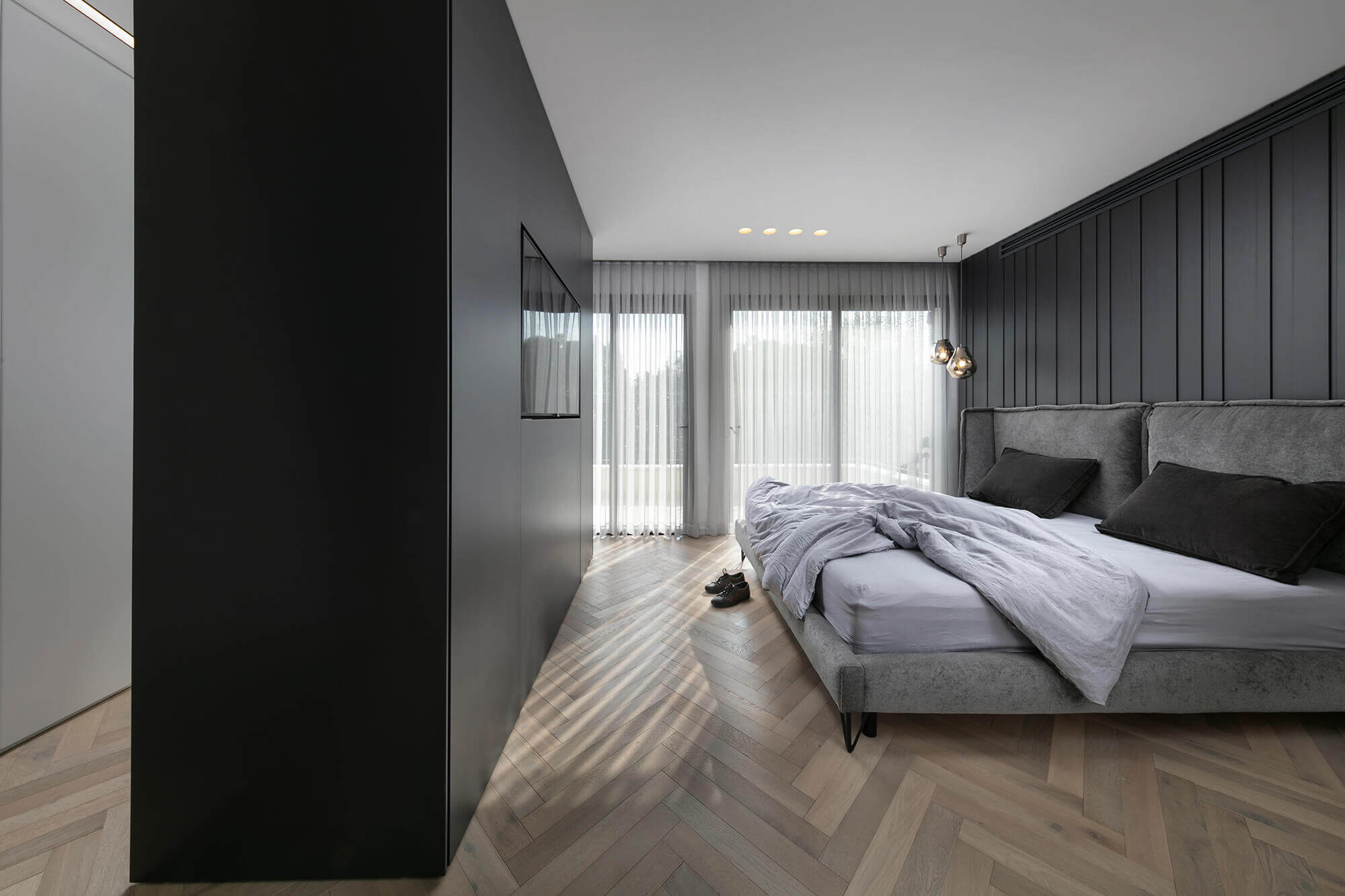 מטבח מודרני נאנו שחור, חדר שינה הנותן תחושה חמימה ועוטפת בעזרת חיפוי קיר ראש מיטה המתחבר לדלת השירותים בקו אפס.