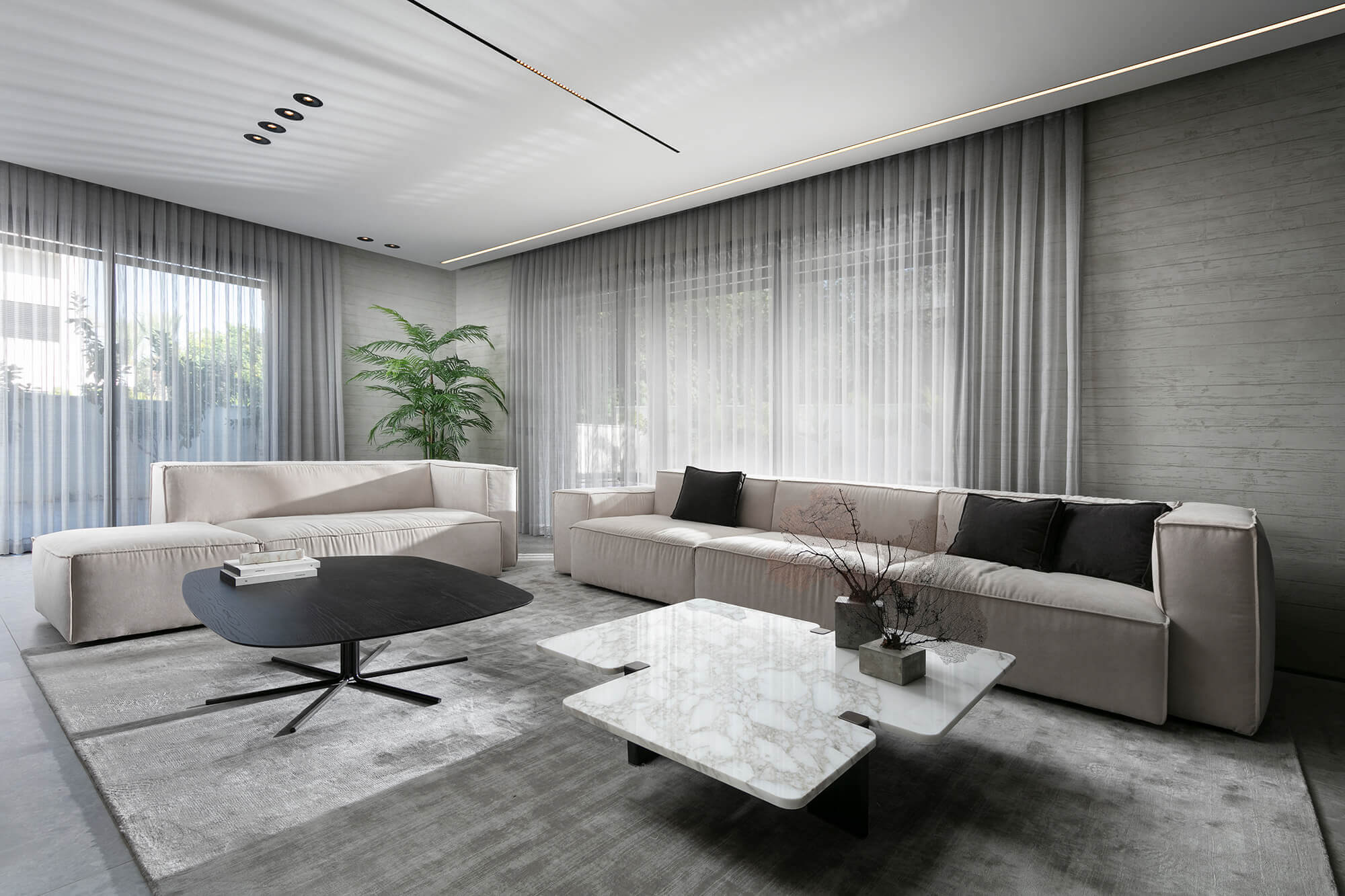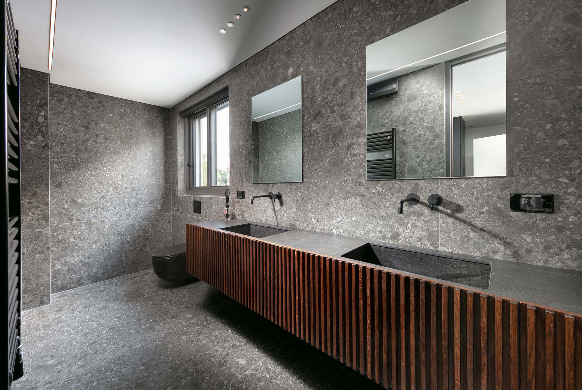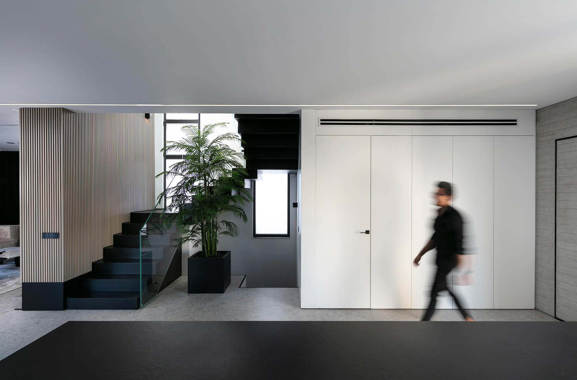 הנגרות כוללת חיפוי קיר תלת מימד בגוון כהה, קיר טלוויזיה משולב חיפוי קיר גרם מדרגות,