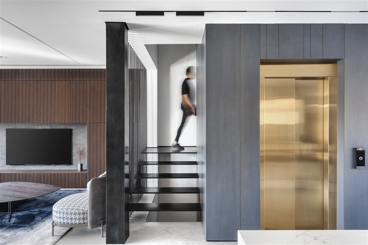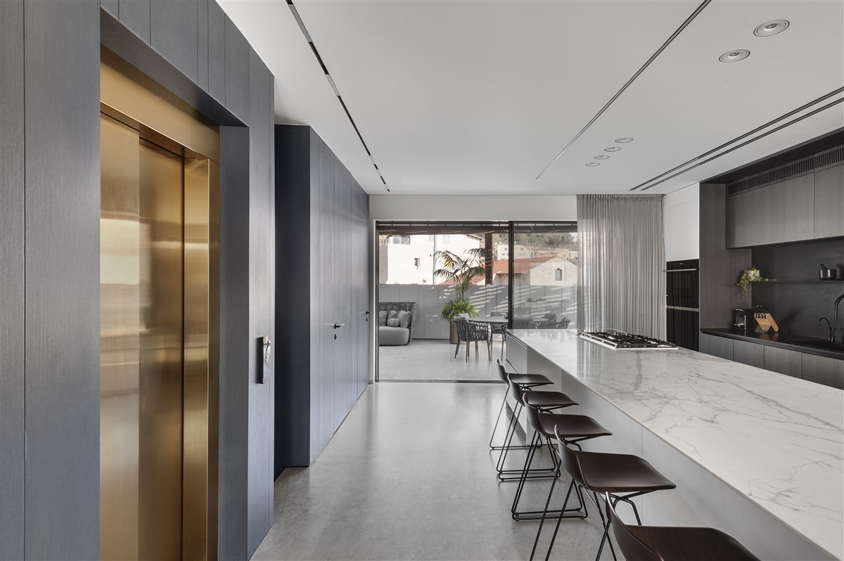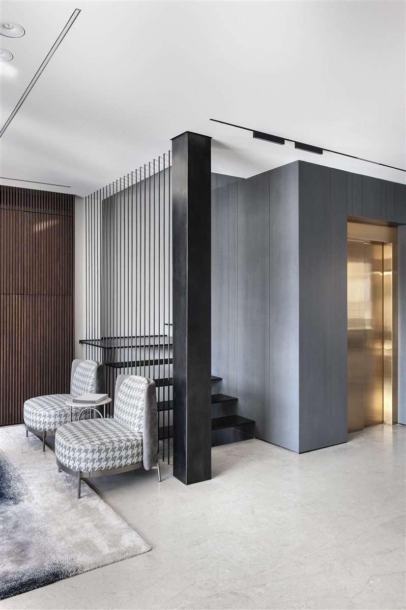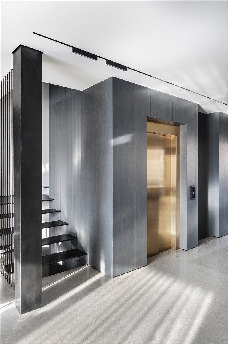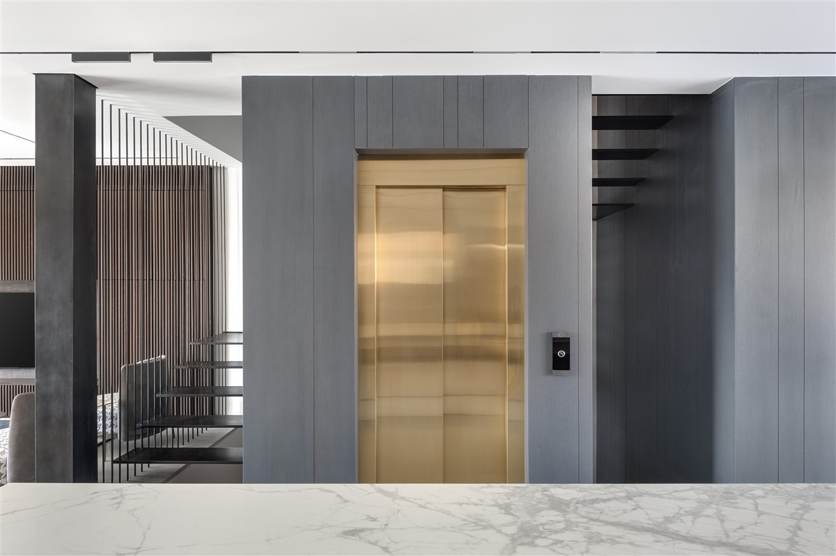 פרויקט נגרות מיוחד, עבודת נגרות בהתאמה אישית הכוללת חיפוי קיר מורכב מסביב לציר מעלית המתפרס לאורך 3 קומות.