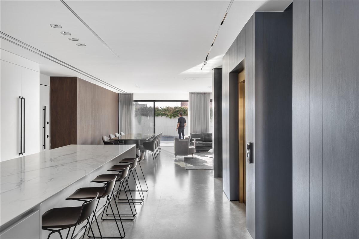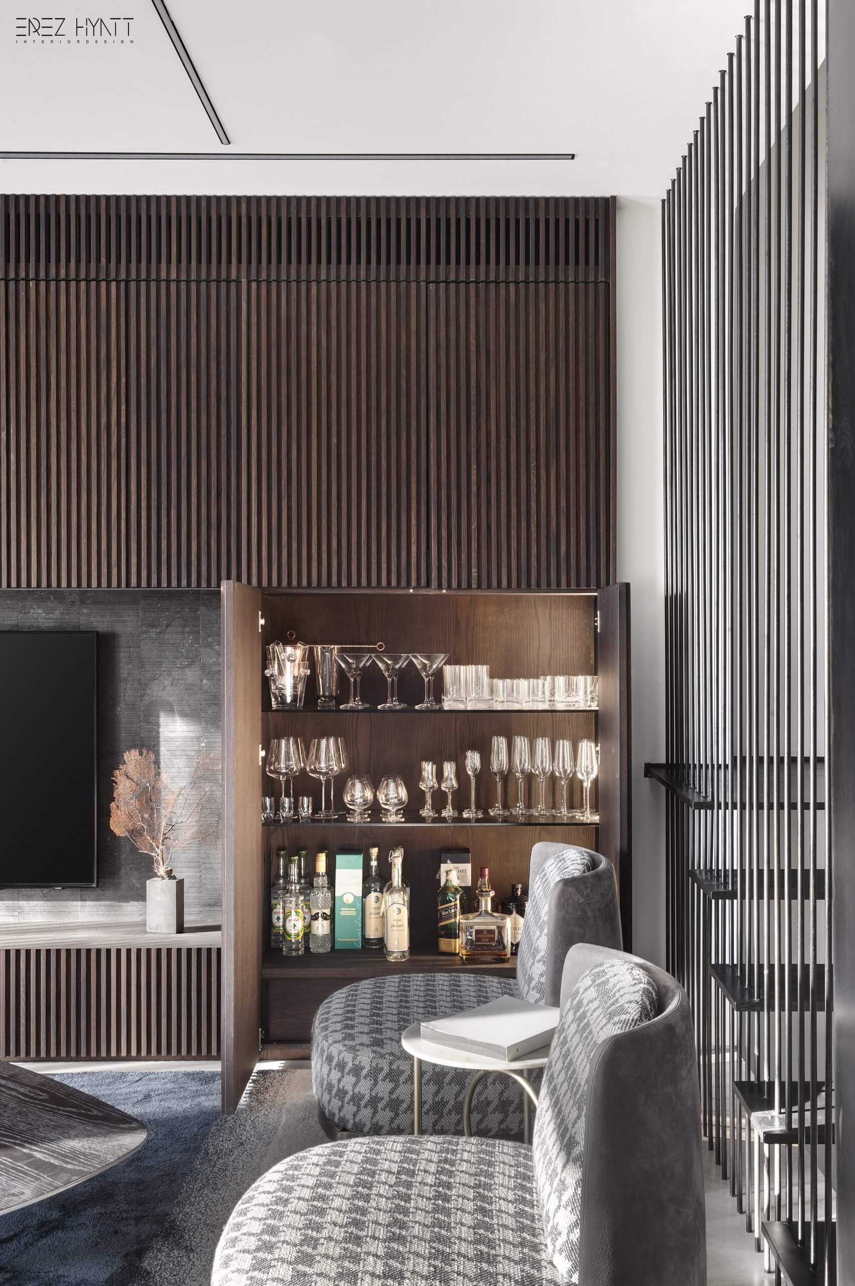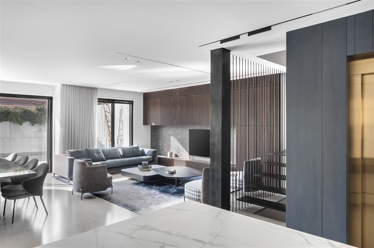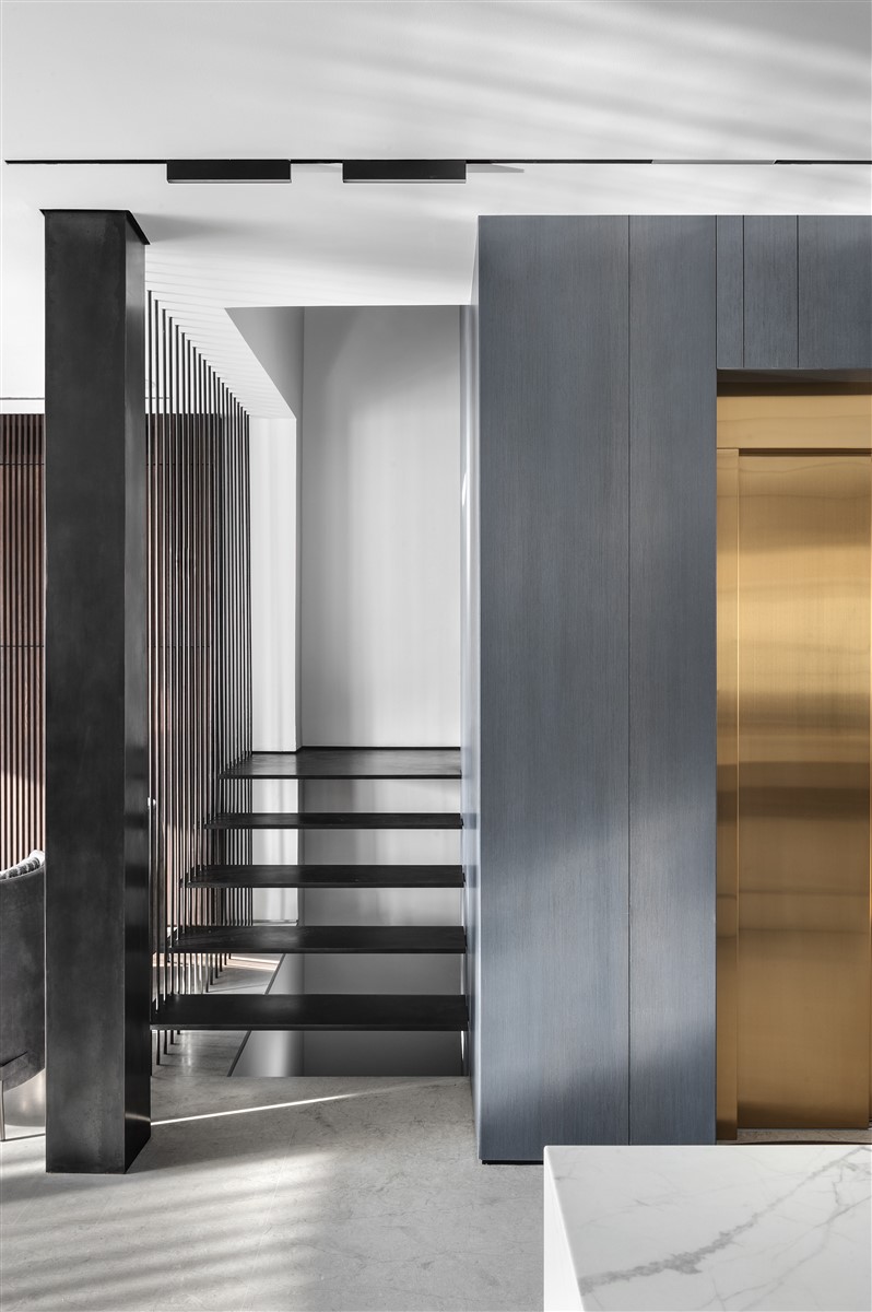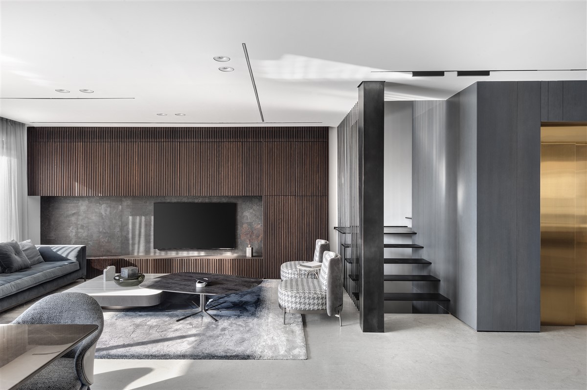 פרויקט נגרות מיוחד, עבודת נגרות בהתאמה אישית הכוללת חיפוי קיר מורכב מסביב לציר מעלית המתפרס לאורך 3 קומות.