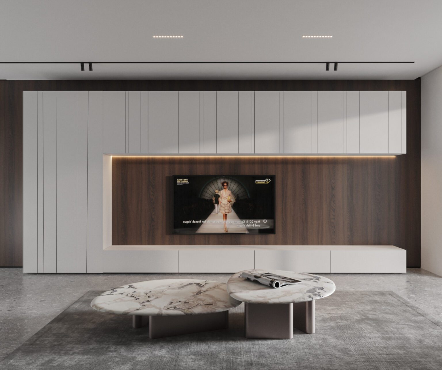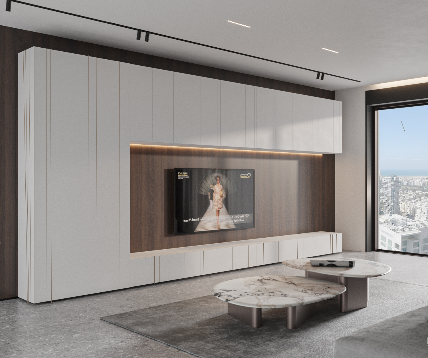 קיר TV חזיתות צבע אפוקסי, או פורניר לבחירה, חירוץ תלת ממד כולל סגירה דקורטיבית בקיר הטלווזיה