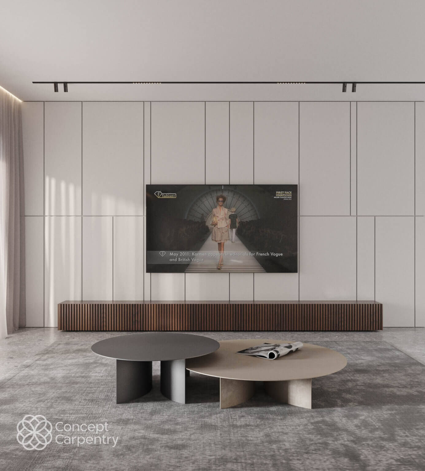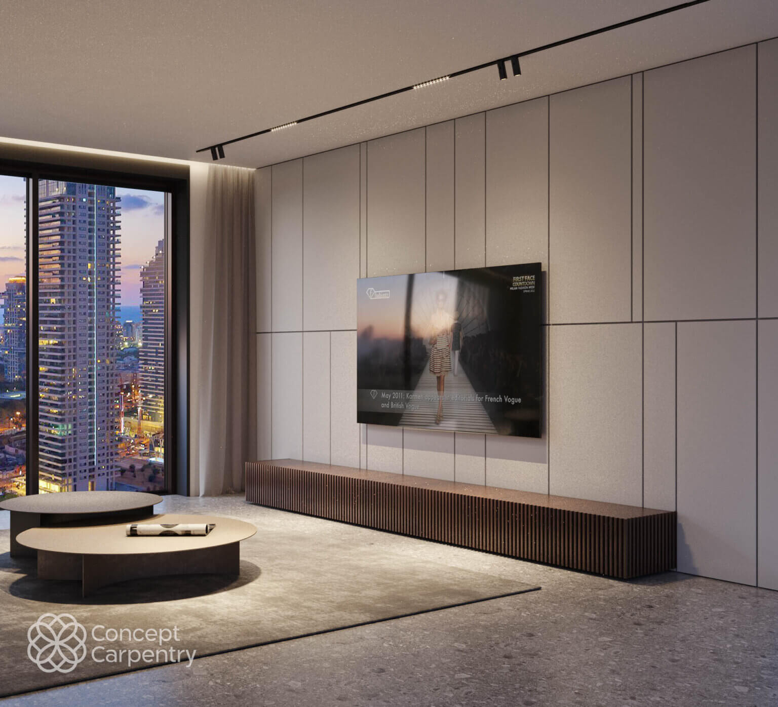 קיר TV חזיתות צבע אפוקסי, או פורניר לבחירה, חירוץ תלת ממד כולל סגירה דקורטיבית בקיר הטלווזיה