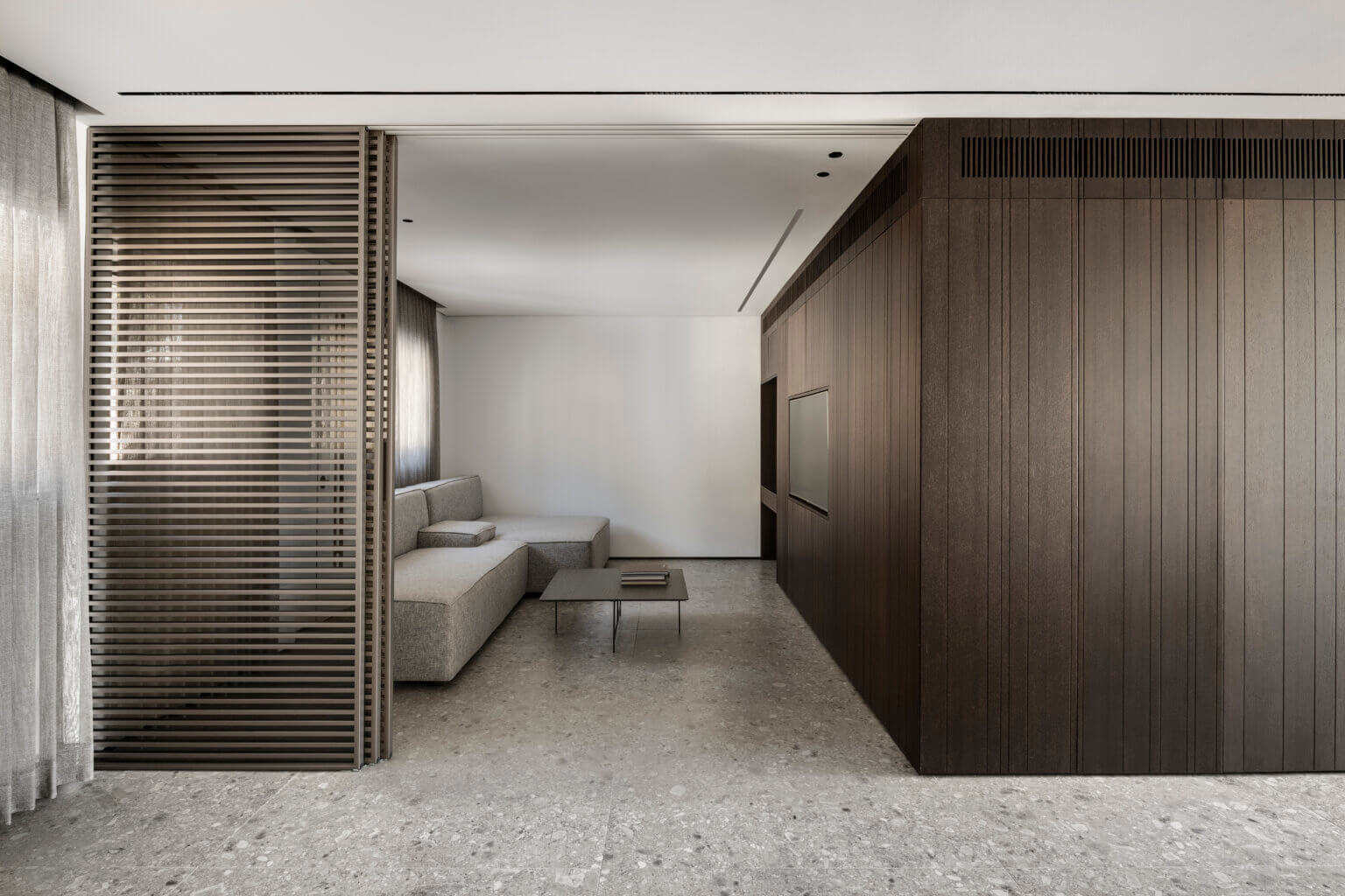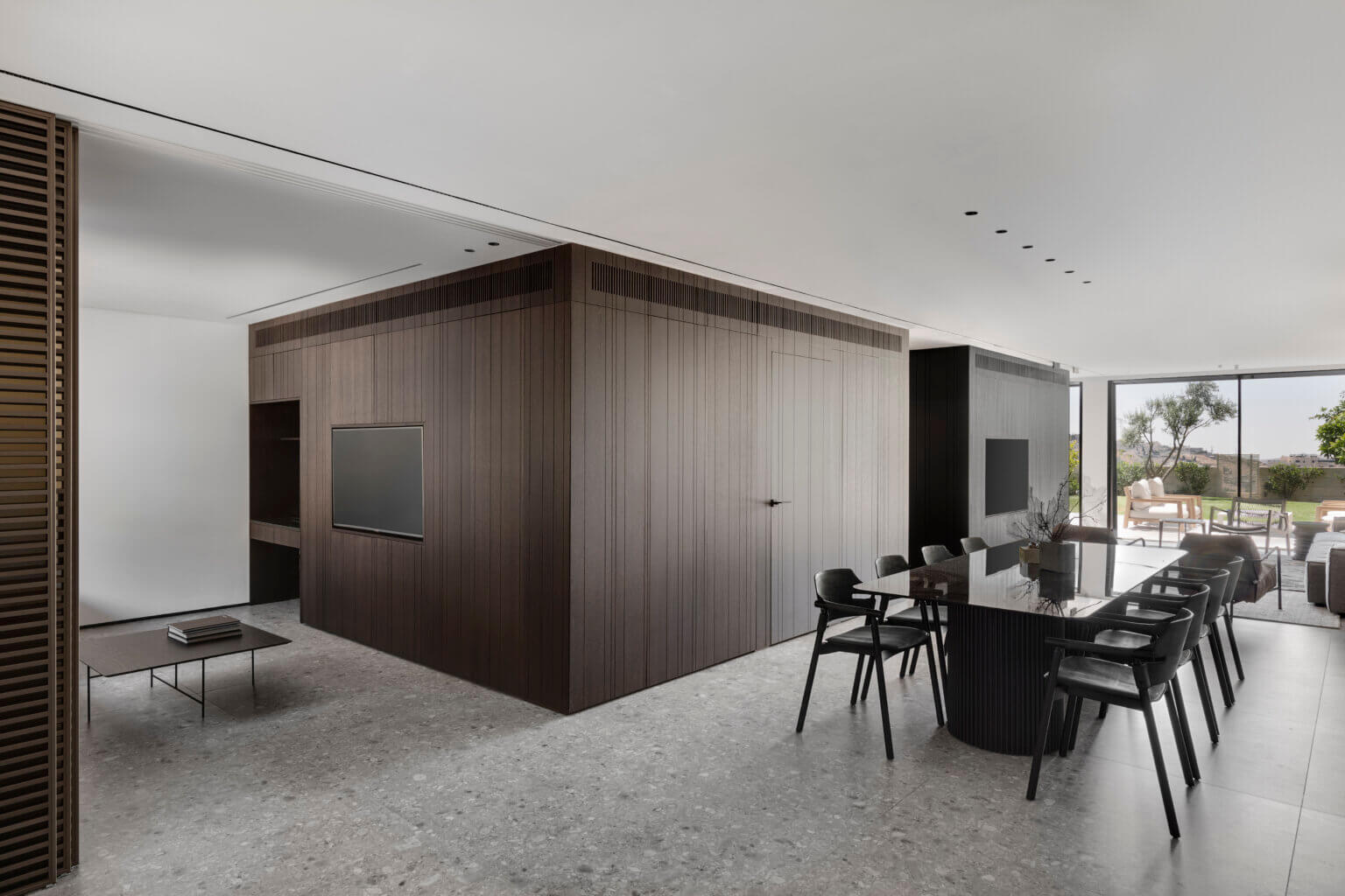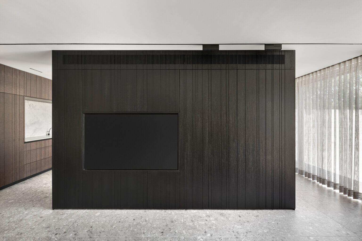 קיר TV חזיתות צבע אפוקסי, או פורניר לבחירה, חירוץ תלת ממד כולל סגירה דקורטיבית בקיר הטלווזיה