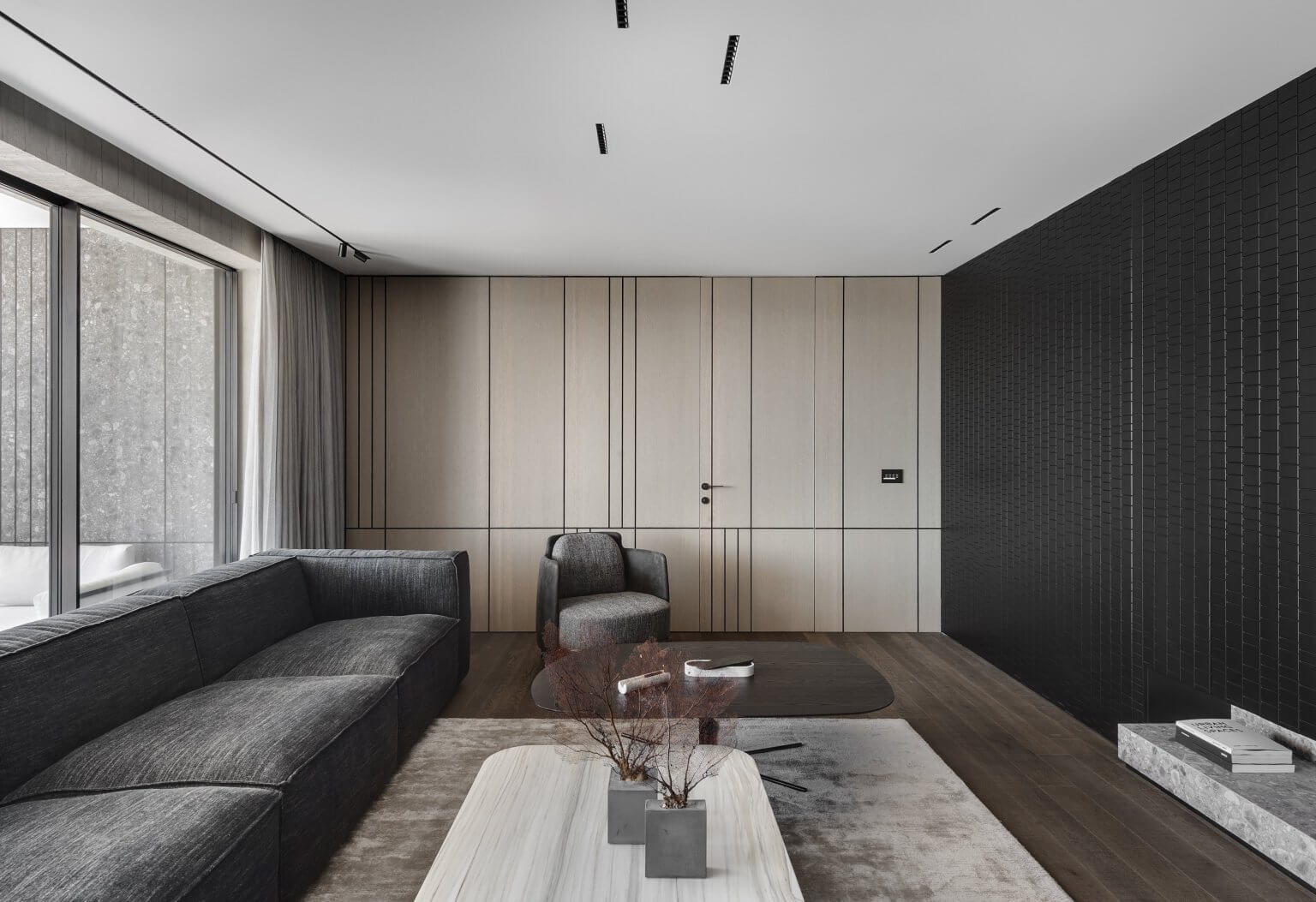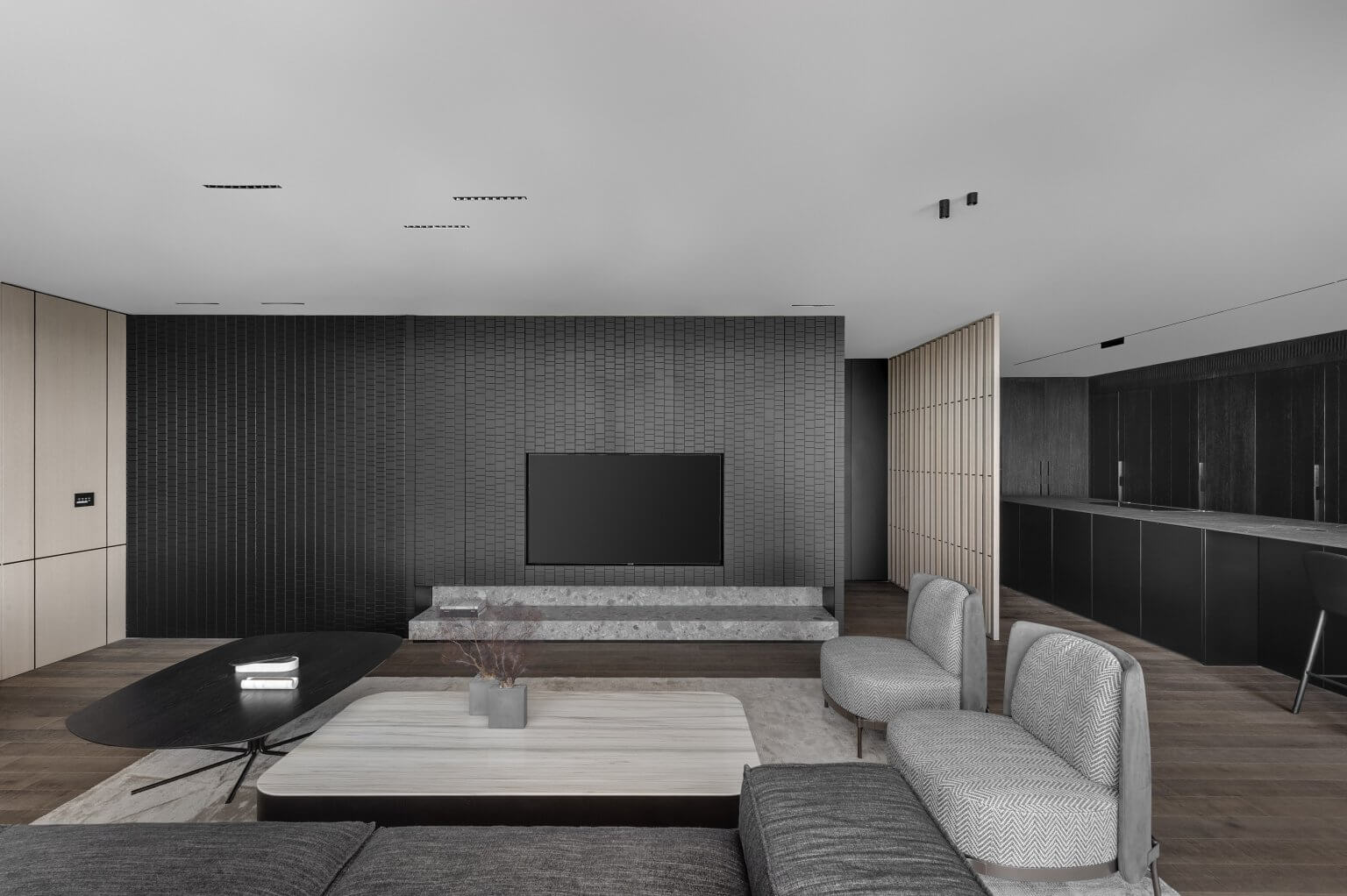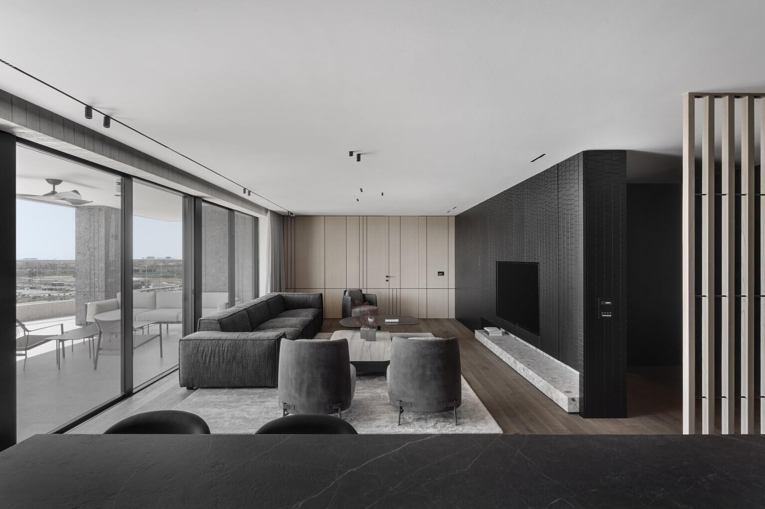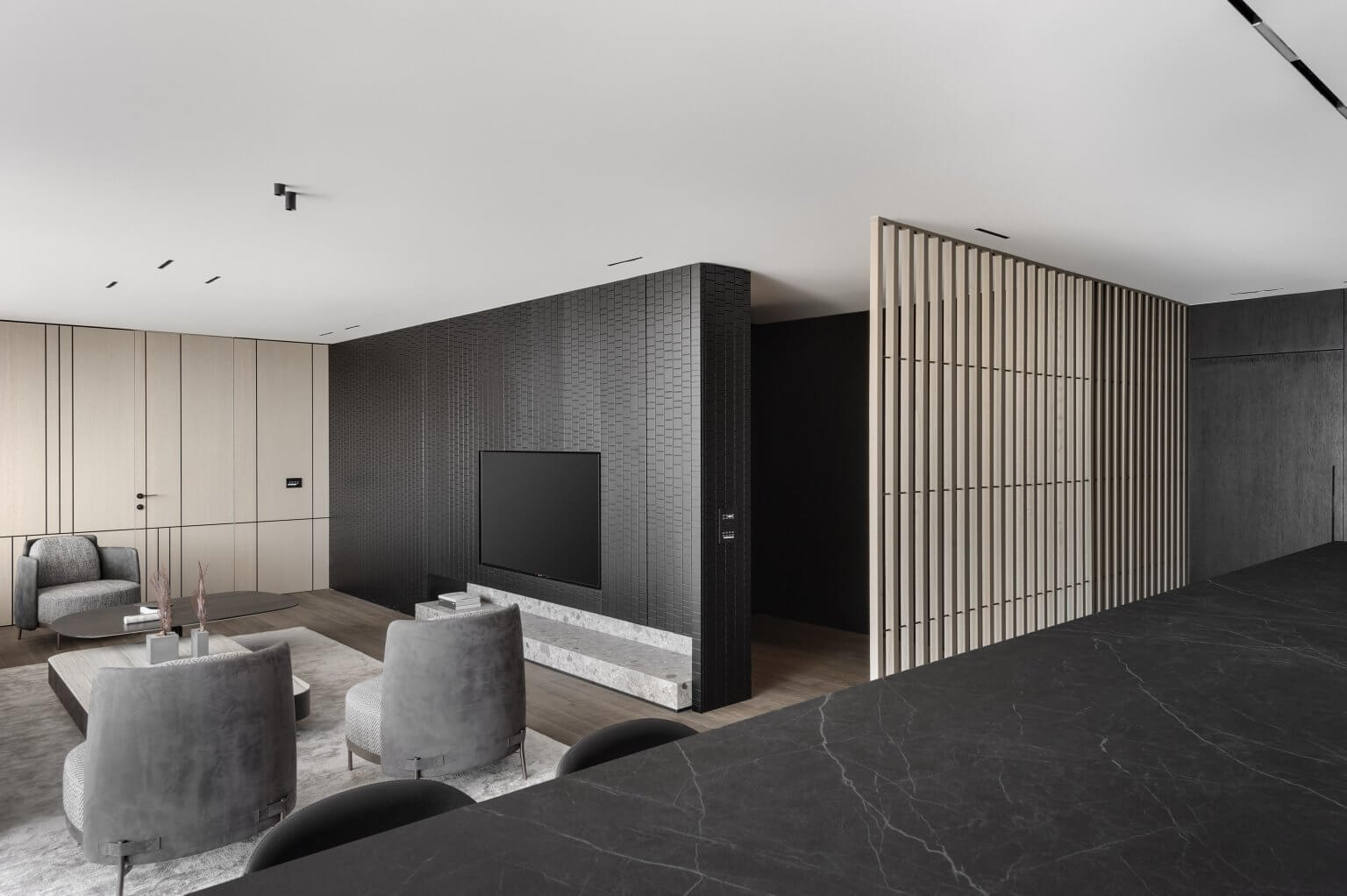 קיר TV חזיתות צבע אפוקסי, או פורניר לבחירה, חירוץ תלת ממד כולל סגירה דקורטיבית בקיר הטלווזיה
