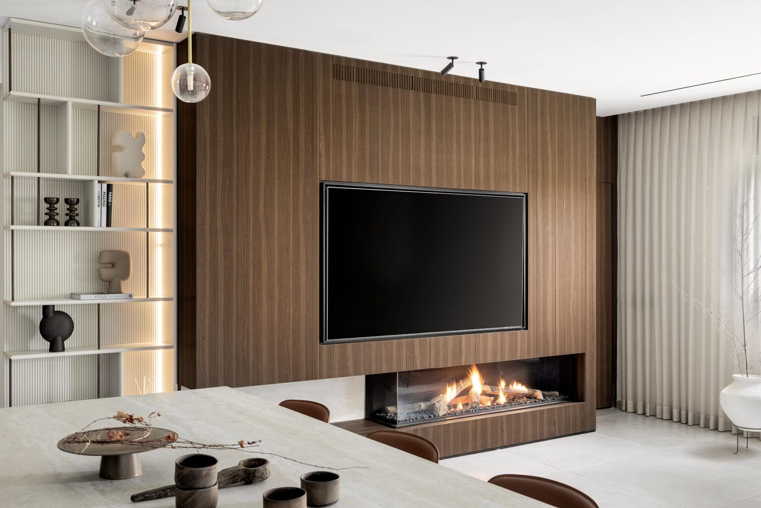 קיר טלוויזיה עם אחסון כולל קמין גז חזיתות פורניר מחורץ ברקוד ב- cnc בשילוב יחידה פתוחה צבוע אפוקסי ותאורת לד