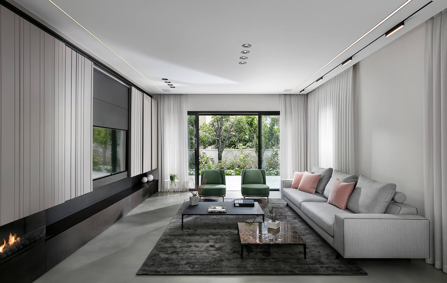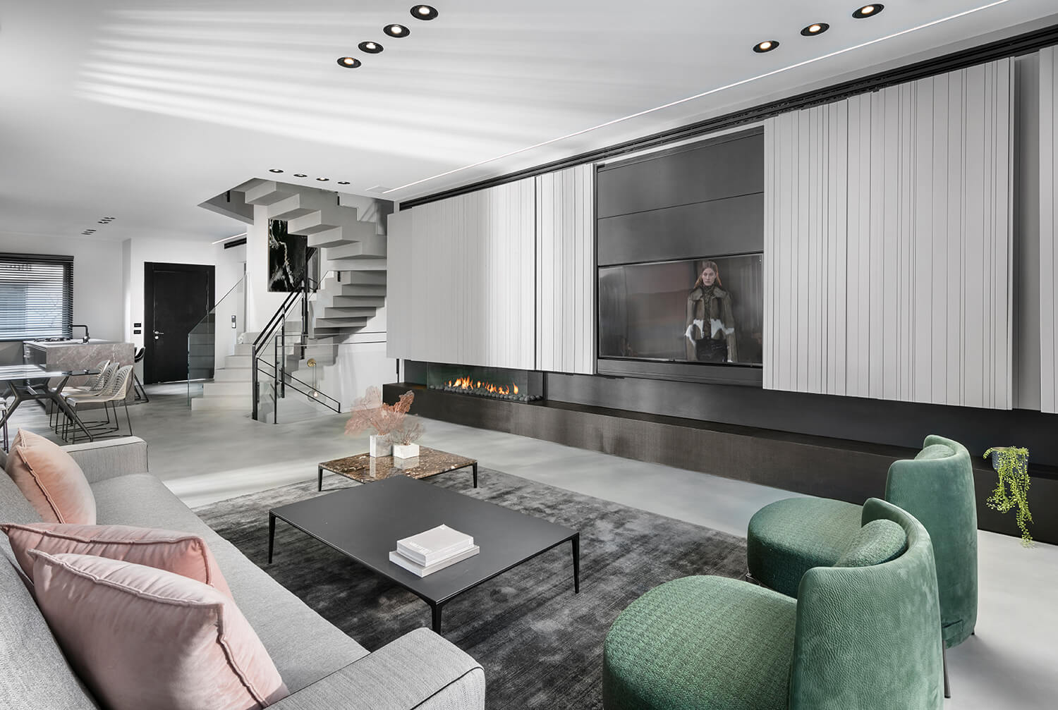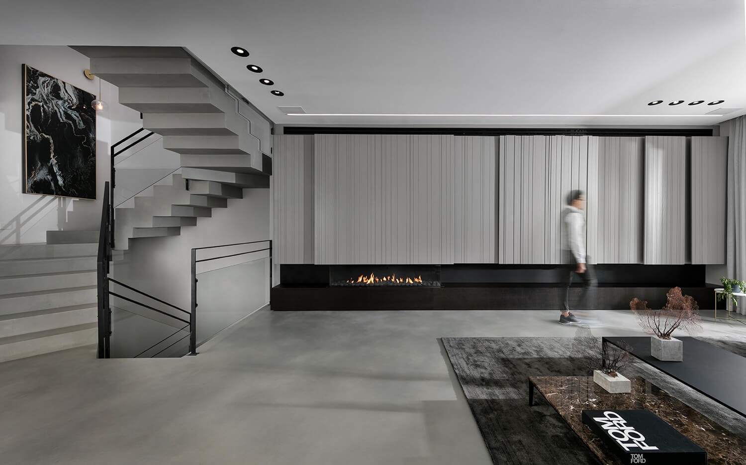 קיר TV עם אחסון חזיתות צבע אפוקסי, חירוץ תלת ממד כולל סגירה דקורטיבית בקיר הטלווזיה קיר טלוויזיה כולל קמין גז