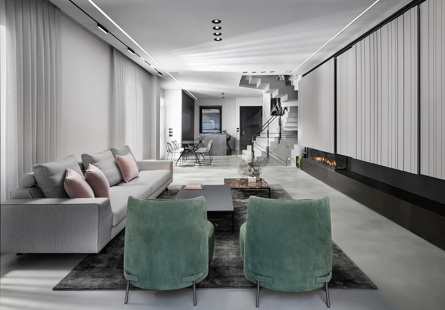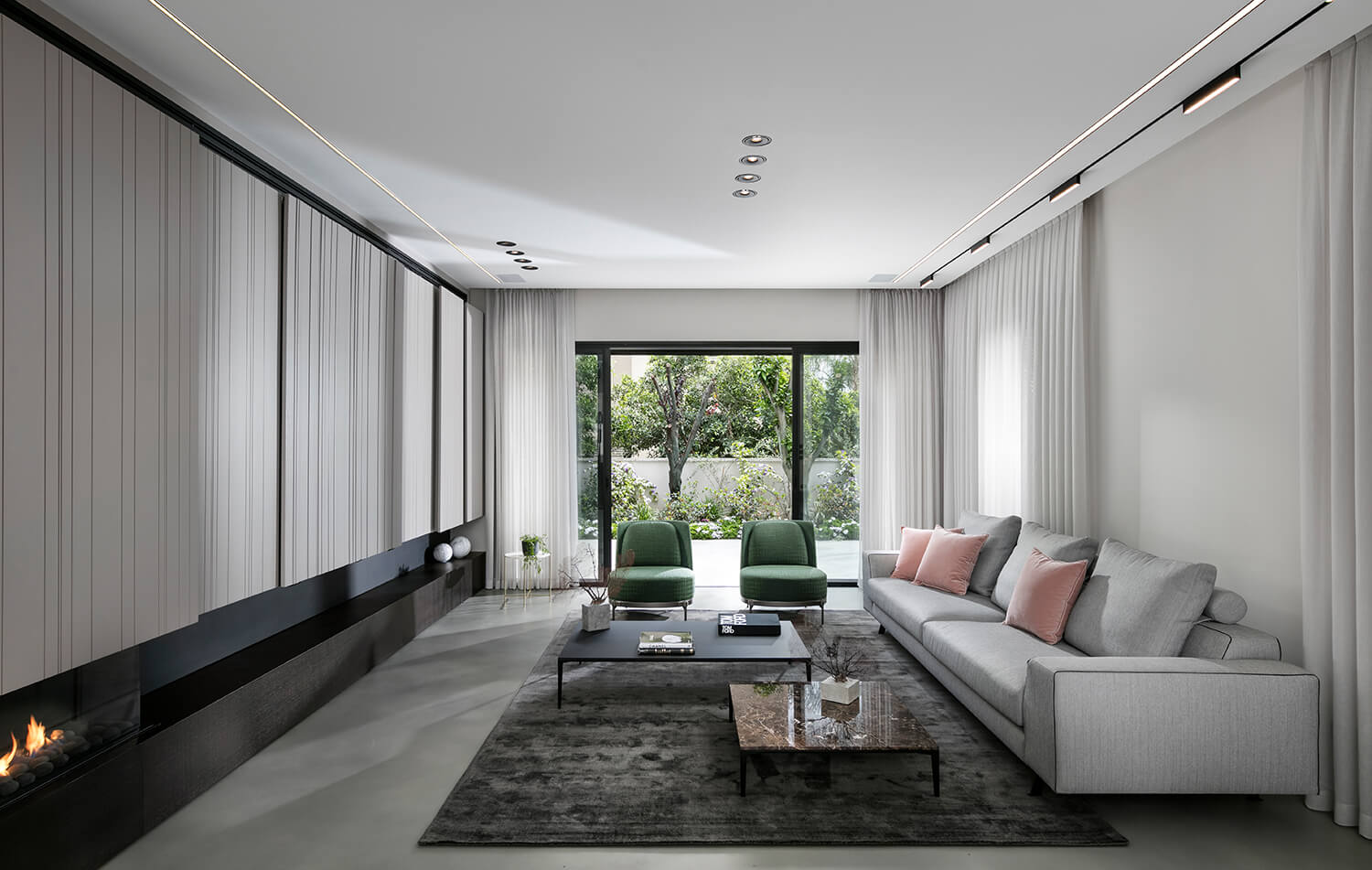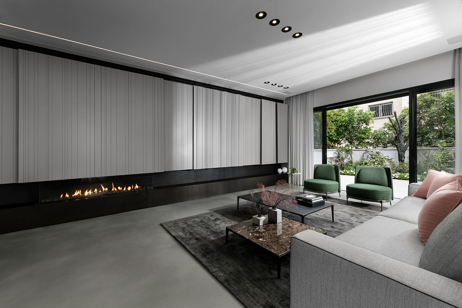 קיר TV עם אחסון חזיתות צבע אפוקסי, חירוץ תלת ממד כולל סגירה דקורטיבית בקיר הטלווזיה קיר טלוויזיה כולל קמין גז